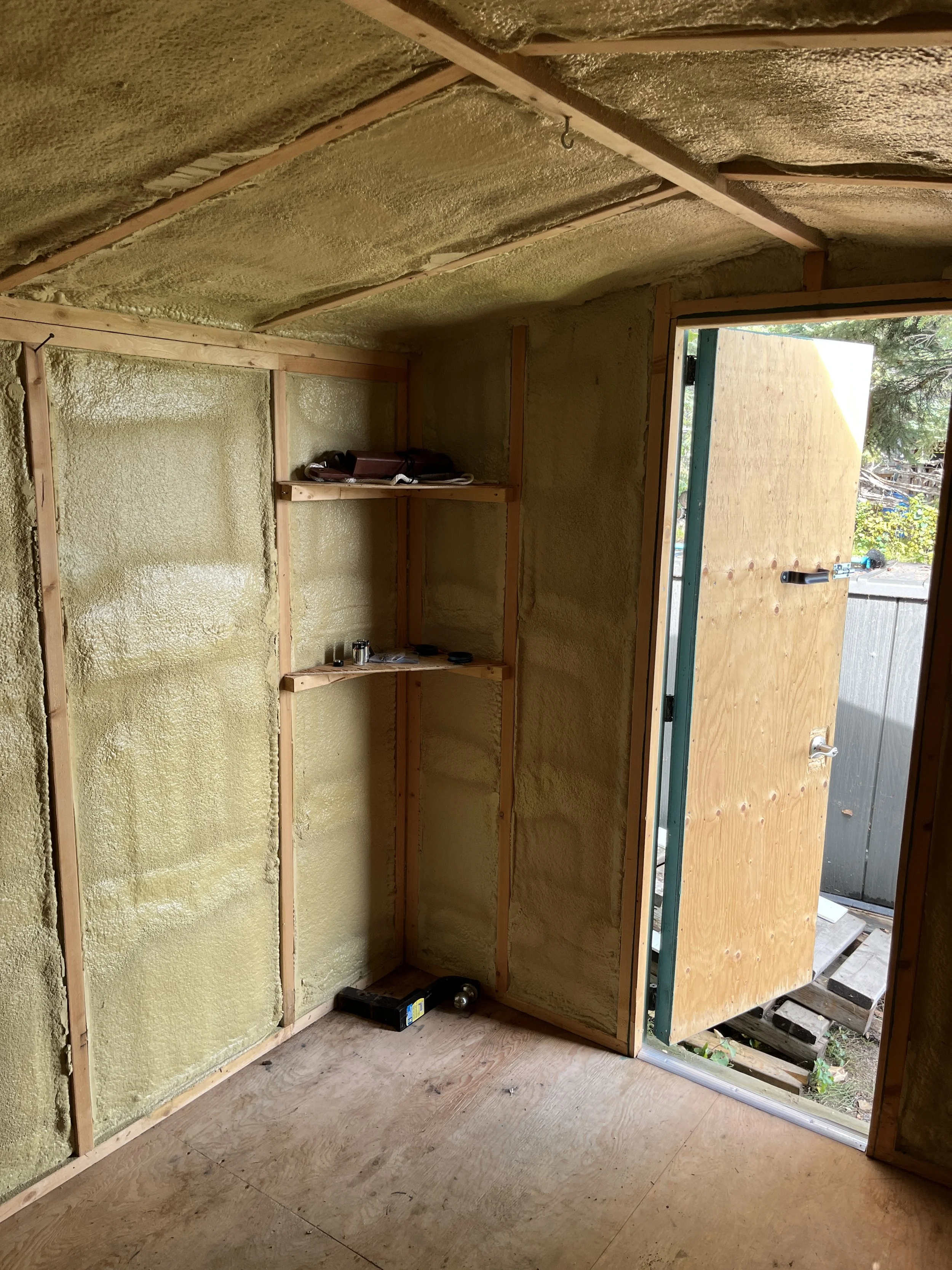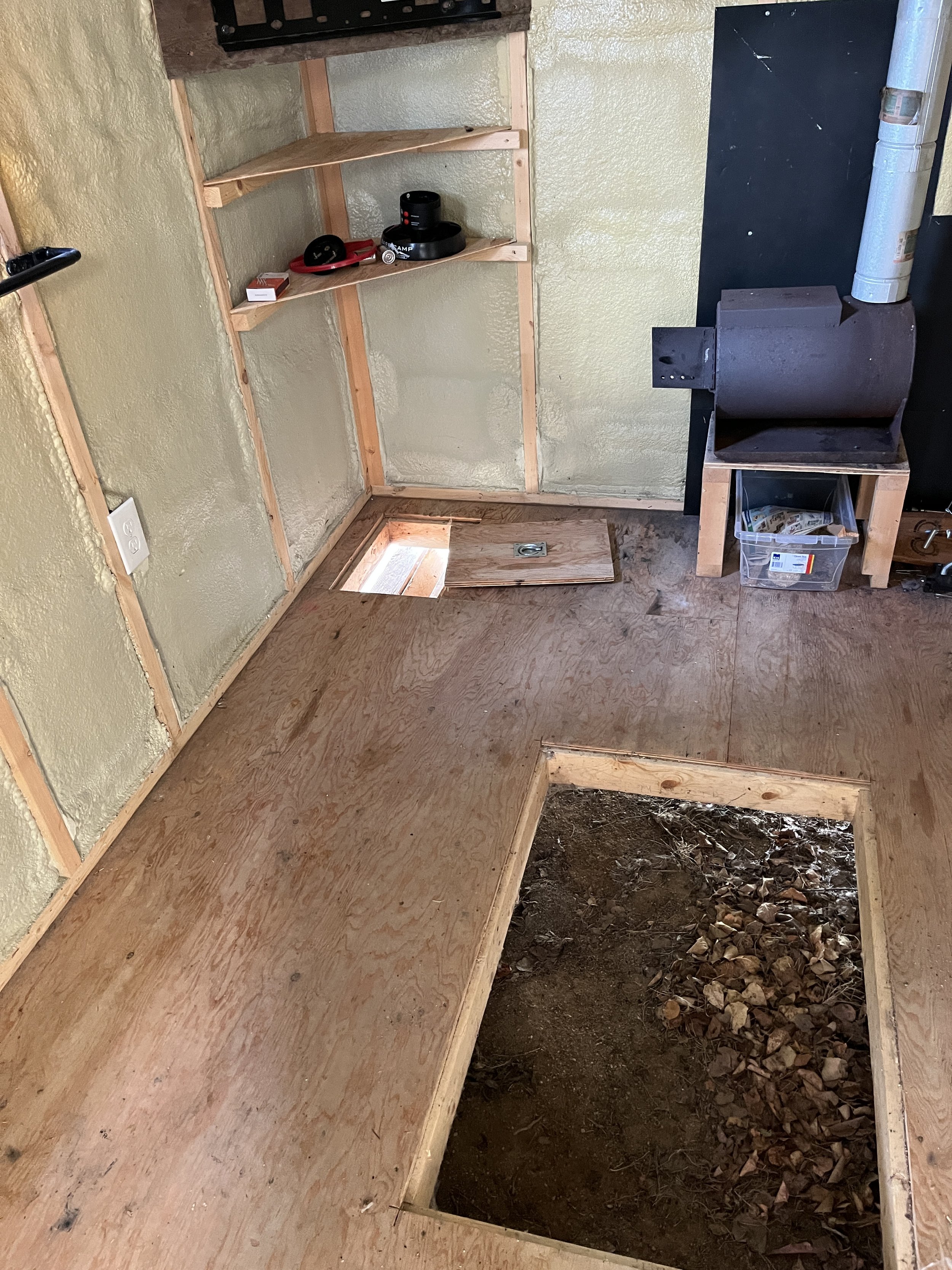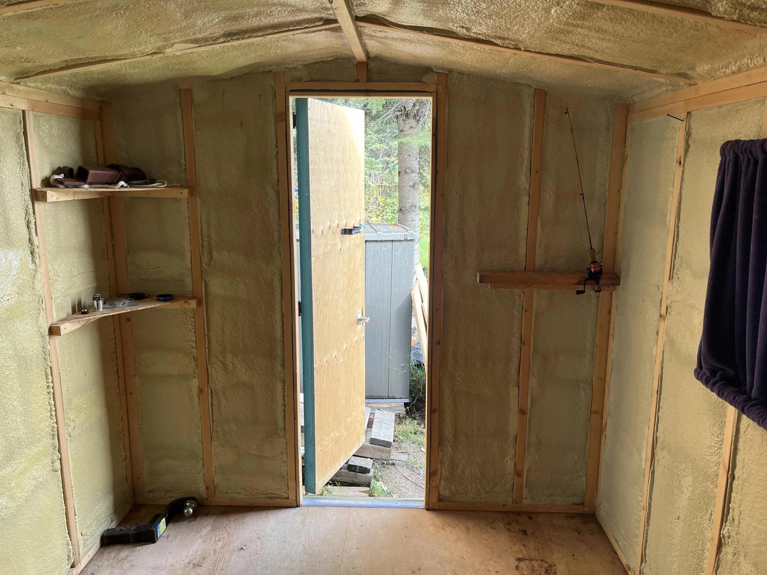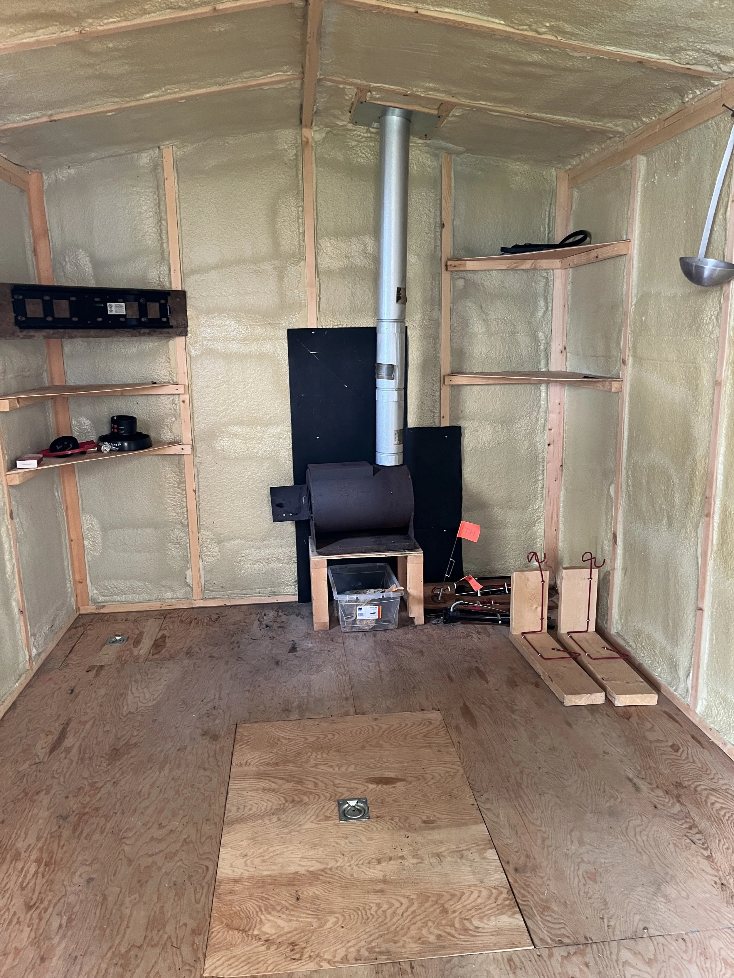 Professionally spray foamed to extra warmth and corner shelving to store supplies